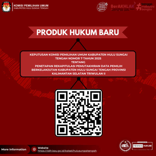 Barabai, 27 Agustus 2025 – Hai #TemanPemilih Komisi Pemilihan Umum (KPU) Kabupaten Hulu Sungai Tengah (HST) kembali menunjukkan komitmennya dalam menjaga integritas data pemilih. KPU HST telah menerbitkan produk hukum terbaru, yaitu Keputusan KPU Kabupaten Hulu Sungai Tengah Nomor 7 Tahun 2025 tentang Penetapan Rekapitulasi Pemutakhiran Data Pemilih Berkelanjutan (DPB) Kabupaten Hulu Sungai Tengah Provinsi Kalimantan Selatan Triwulan II. Keputusan ini merupakan langkah strategis KPU dalam memastikan bahwa data pemilih selalu akurat dan mutakhir. Pemutakhiran data secara berkelanjutan adalah bagian penting dari persiapan menghadapi berbagai tahapan pemilihan, baik pilkada, pilpres, maupun pileg di masa depan. Proses ini bertujuan untuk mencatat pemilih baru, menghapus pemilih yang sudah tidak memenuhi syarat (misalnya meninggal dunia atau pindah domisili), serta memperbaiki data pemilih yang tidak valid. Dengan begitu, hak konstitusional warga negara untuk memilih dapat terjamin. Bapak Ardiansyah, selaku Ketua KPU Kabupaten Hulu Sungai Tengah, menyatakan bahwa produk hukum ini adalah wujud nyata dari upaya KPU untuk bekerja secara transparan dan akuntabel. "Publik berhak tahu bagaimana kami mengelola data pemilih. Keputusan ini kami publikasikan agar dapat diakses oleh semua pihak yang berkepentingan, baik partai politik, lembaga pemantau, maupun masyarakat umum," ujarnya. Dokumen lengkap dari Keputusan KPU ini dapat diakses secara mudah melalui platform Jaringan Dokumentasi dan Informasi Hukum (JDIH) KPU. Masyarakat bisa langsung memindai kode QR yang tertera pada pengumuman atau mengunjungi tautan resmi. Langkah ini sejalan dengan prinsip keterbukaan informasi publik yang dipegang teguh oleh KPU. KPU HST berharap dengan adanya produk hukum ini, semua pihak dapat ikut mengawasi dan memberikan masukan demi perbaikan data pemilih di Kabupaten Hulu Sungai Tengah. Keterlibatan masyarakat sangat dibutuhkan untuk memastikan setiap pemilihan berjalan adil, jujur, dan berintegritas. ....