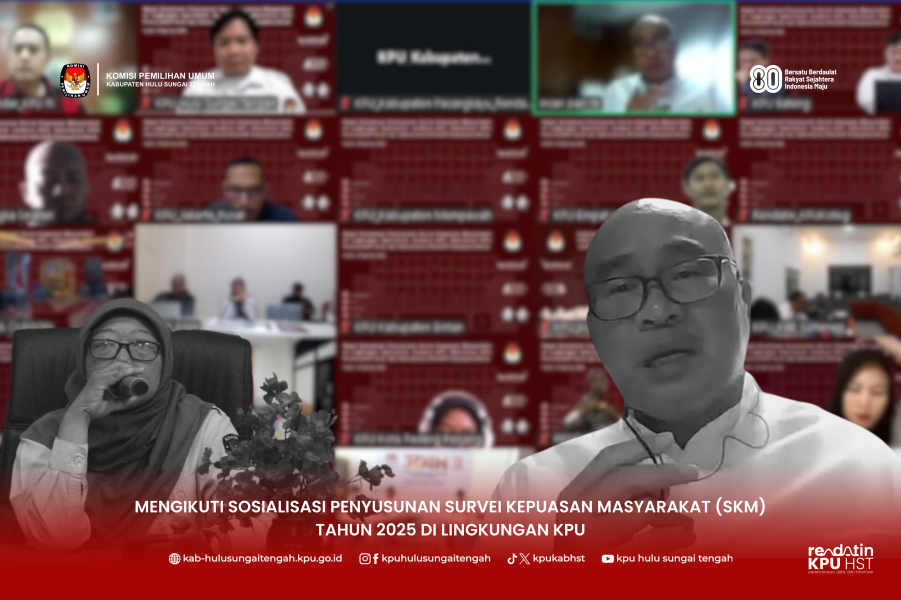 Barabai, 28 Agustus 2025 – KPU Kabupaten Hulu Sungai Tengah melalui Kasubag dan staf Divisi Rendatin turut berhadir dalam kegiatan Sosialisasi Penyusunan Survei Kepuasan Masyarakat (SKM) Tahun 2025 yang diselenggarakan oleh Komisi Pemilihan Umum (KPU) Republik Indonesia secara daring melalui Zoom Meeting, Kamis (28/8). Kegiatan yang dibuka pukul 10.00 WIB ini merupakan tindak lanjut dari Surat Sekretaris Jenderal KPU Nomor 2981/ORT.07-SD/01/2025 tentang pelaksanaan SKM di lingkungan Sekretariat Jenderal KPU, Sekretariat KPU Provinsi, serta Sekretariat KPU Kabupaten/Kota. Sosialisasi ini penting sebagai upaya pemenuhan Indeks Kepuasan Masyarakat (IKM) dan bagian dari Evaluasi Reformasi Birokrasi KPU Tahun 2025. Dalam rangkaian acara, peserta mendapatkan materi kebijakan pelaksanaan SKM dari Asisten Deputi Pemberdayaan Partisipasi Publik, Kementerian PANRB, serta arahan teknis penyusunan SKM yang disampaikan oleh narasumber dari Kedeputian Pelayanan Publik, Kementerian PANRB. Sesi dilanjutkan dengan diskusi dan tanya jawab yang memberikan ruang bagi peserta, termasuk KPU Hulu Sungai Tengah, untuk memperdalam pemahaman teknis terkait implementasi SKM di daerah. Kehadiran Kasubag dan staf Divisi Rendatin KPU Kabupaten Hulu Sungai Tengah menegaskan komitmen KPU HST dalam mendukung peningkatan kualitas layanan publik di lingkungan KPU. “Kehadiran dalam sosialisasi ini menjadi penting agar KPU Hulu Sungai Tengah dapat melaksanakan SKM secara tepat dan terukur. Hasil survei nantinya akan menjadi bahan evaluasi bagi kami untuk terus memperbaiki mutu pelayanan publik,” ujar Kasubag Rendatin KPU Hulu Sungai Tengah. Dengan adanya sosialisasi ini, KPU Hulu Sungai Tengah siap menindaklanjuti pedoman pelaksanaan SKM Tahun 2025 dan berkomitmen menjadikan hasil survei sebagai pijakan dalam peningkatan kualitas pelayanan serta reformasi birokrasi di tingkat daerah. ....
