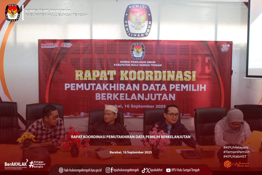 Hulu Sungai Tengah – Komisi Pemilihan Umum (KPU) Kabupaten Hulu Sungai Tengah (HST) menggelar Rapat Koordinasi Pemutakhiran Data Pemilih Berkelanjutan (PDPB), Selasa 16 September 2025. Kegiatan ini dibuka oleh Anggota KPU HST, Siswandi Reya'an, dan menghadirkan pemaparan utama dari Dr. Murjani selaku Divisi Perencanaan, Data, dan Informasi. Dalam paparannya, Dr. Murjani menekankan pentingnya rakor ini sebagai langkah awal menyiapkan tahapan Pemilu 2029, khususnya menghadapi verifikasi partai politik yang akan datang. Ia mengingatkan bahwa perubahan regulasi kepartaian dan penerapan presidential threshold akan berdampak signifikan, sehingga partai politik perlu lebih matang mempersiapkan dukungan serta basis data pemilih. “Data pemilih bukan sekadar objek, melainkan subjek yang harus dijaga hak pilihnya agar tercipta pemilih cerdas dan pada akhirnya melahirkan pemimpin yang berkualitas,” ujarnya. Rakor ini juga menjadi forum silaturahmi dan koordinasi lintas lembaga. Perwakilan dari Kodim 1002/HST, Polres HST, Dinas Dukcapil, Bawaslu, Kesbangpol, hingga partai politik, menyampaikan dukungan, masukan, dan kesiapan bersinergi dalam menjaga validitas data pemilih. Tanggapan yang muncul menyoroti pentingnya sinkronisasi data pensiun TNI/Polri, pemutakhiran data kependudukan, serta transparansi alur pencatatan pemilih baru maupun pemilih yang tidak memenuhi syarat (TMS). Melalui rapat koordinasi ini, KPU HST berharap tercipta kesepahaman bersama bahwa akurasi data pemilih adalah fondasi utama demokrasi. Dengan sinergi lintas instansi, pemutakhiran data diharapkan berjalan lebih valid, transparan, dan akuntabel, sehingga seluruh pihak siap menghadapi verifikasi partai politik serta tahapan Pemilu 2029 dengan lebih baik. ....