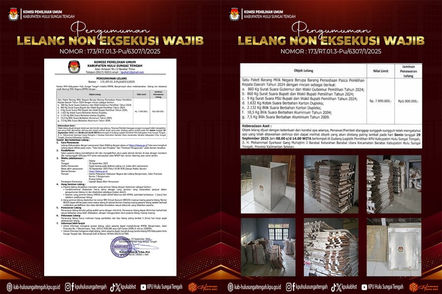 Hulu Sungai Tengah – Komisi Pemilihan Umum (KPU) Kabupaten Hulu Sungai Tengah mengumumkan pelaksanaan lelang satu paket Barang Milik Negara (BMN) berupa barang persediaan pasca Pemilihan Kepala Daerah (Pilkada) Tahun 2024, Selasa (23/09/2025) Lelang akan dilaksanakan secara daring pada Selasa, 30 September 2025 melalui laman resmi www.lelang.go.id. Adapun barang yang akan dilelang terdiri dari tujuh objek lelang, yaitu 860 Kg Surat Suara Gubernur dan Wakil Gubernur Pemilihan Tahun 2024; 860 Kg Surat Suara Bupati dan Wakil Bupati Pemilihan Tahun 2024; 9 Kg Surat Suara PSU Bupati dan Wakil Bupati Pemilihan Tahun 2024; 1.632 Kg Kotak Suara Berbahan Karton Dupleksl 2.132 Kg Bilik Suara Berbahan Karton Dupleksl 10,5 Kg Bilik Suara Berbahan Aluminium Tahun 2004; serta 7,5 Kg Bilik Suara Berbahan Aluminium Tahun 2009. Kasubag Divisi Sumber Daya Manusia dan Partisipasi Hubungan Masyarakat KPU Kabupaten Hulu Sungai Tengah menyampaikan bahwa lelang ini dilakukan sesuai dengan ketentuan pengelolaan BMN serta untuk mendukung prinsip transparansi dan akuntabilitas. Masyarakat atau pihak yang ingin berpartisipasi dapat mengakses informasi lengkap mengenai tata cara, persyaratan, serta detail objek lelang melalui portal www.lelang.go.id pada jadwal yang telah ditentukan. Dengan adanya lelang ini, KPU Kabupaten Hulu Sungai Tengah berharap barang persediaan pasca Pilkada 2024 dapat dimanfaatkan kembali oleh pihak yang membutuhkan sesuai aturan yang berlaku. ....