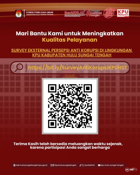 Sebagai bagian dari komitmen kami dalam membangun Zona Integritas menuju Wilayah Bebas Korupsi (WBK) dan Wilayah Birokrasi Bersih dan Melayani (WBBM), KPU Kabupaten Hulu Sungai Tengah secara rutin melaksanakan Survei Eksternal Persepsi Anti Korupsi.