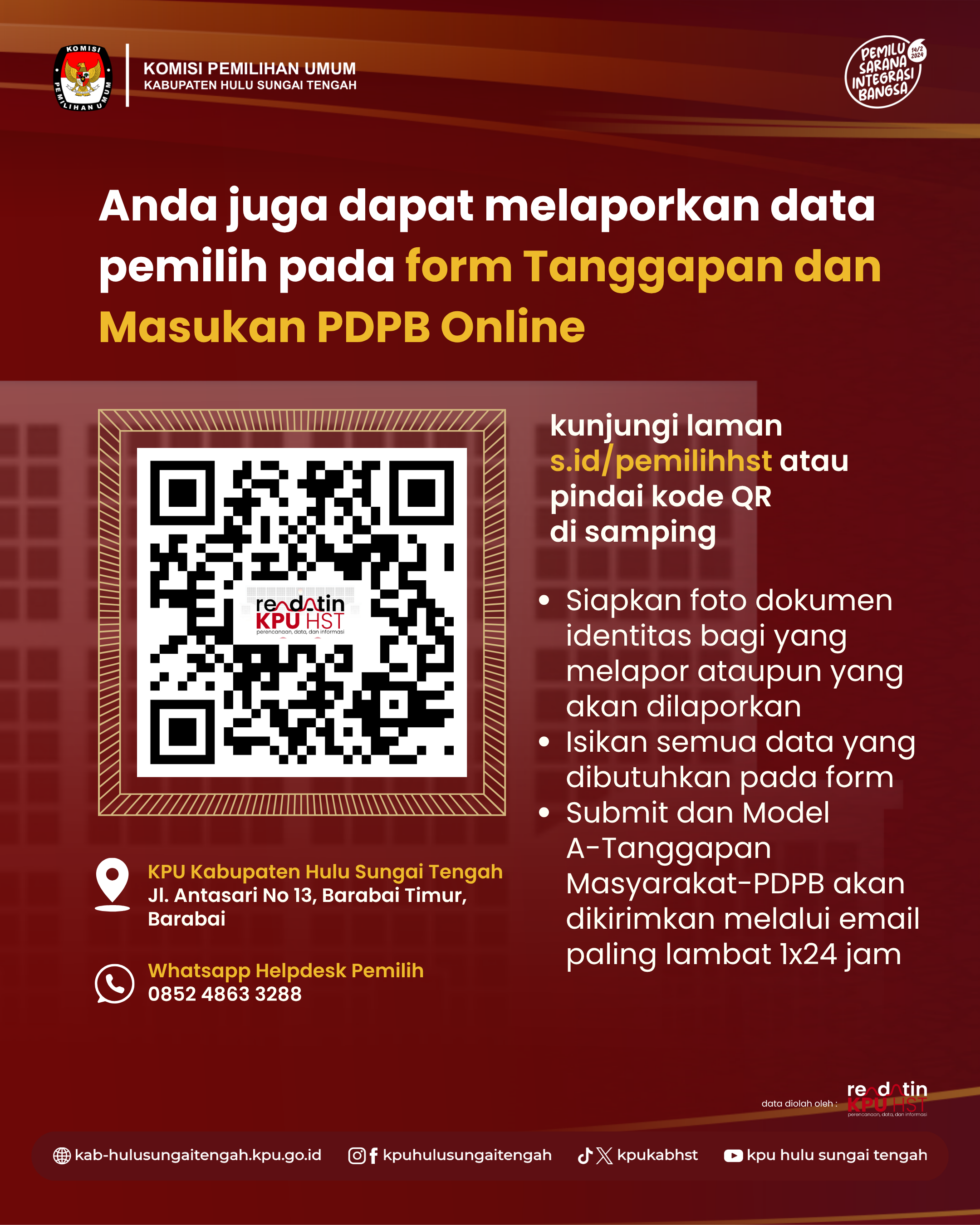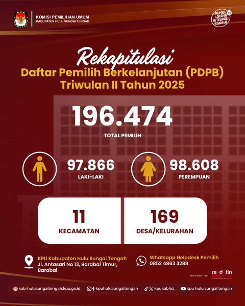 Berikut Daftar Rekapitulasi Pemilih Berkelanjutan (PDPB), kami mengajak masyarakat Hulu Sungai Tengah untuk segera melapor apabila Anda atau keluarga yang belum terdaftar sebagi Pemilih.
