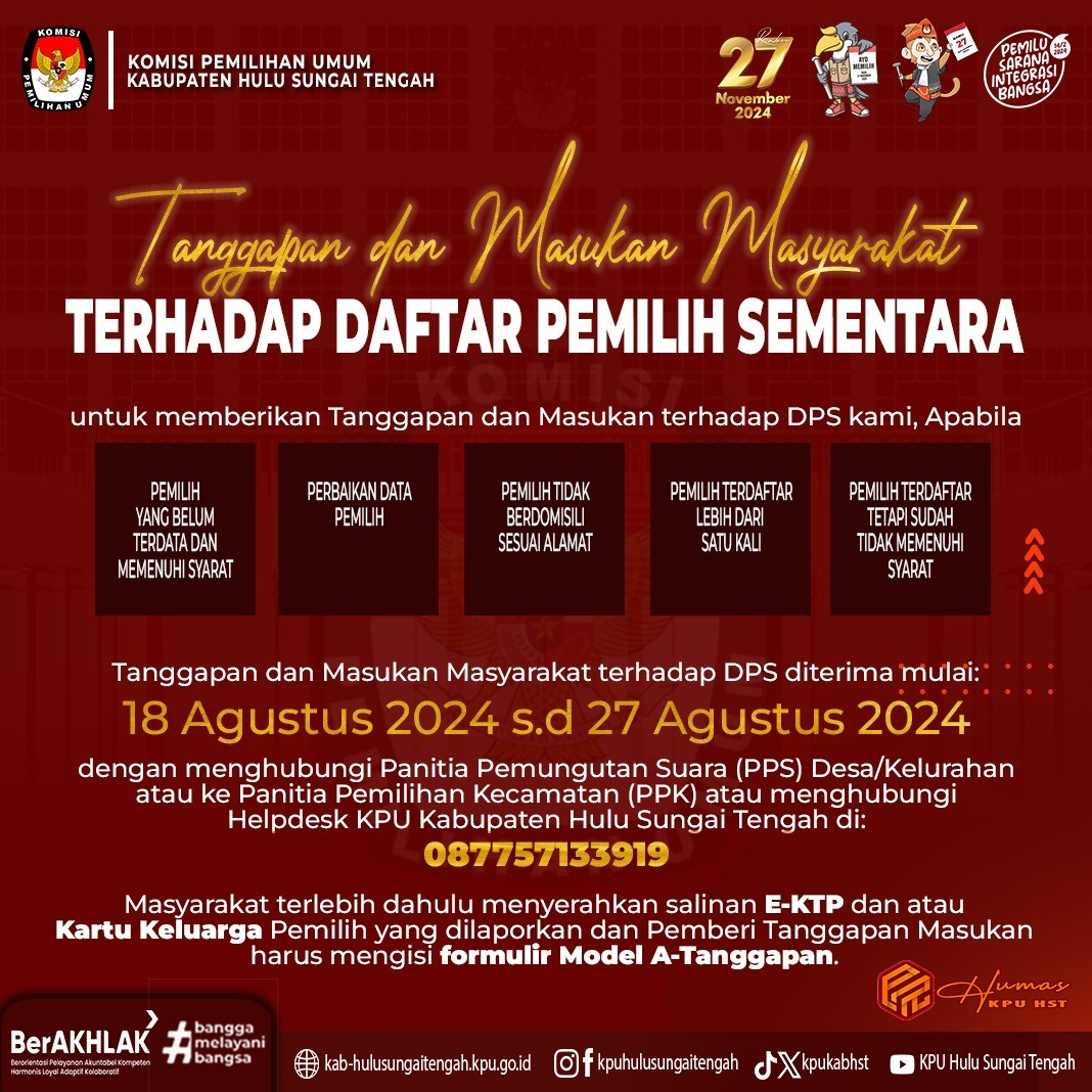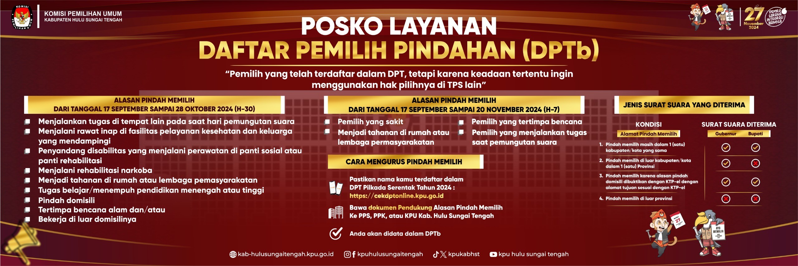 Setelah penetapan Daftar Pemilih Tetap (DPT) yang dilaksanakan pada bulan september lalu, KPU HST memberikan layanan pindah memilih bagi pemilih yang terdaftar di DPT tetapi pada saat hari pemungutan suara karena berbagai macam hal yang menyebabkan tidak bisa memberikan suaranya di TPS dimana pemilih tersebut terdaftar. Proses layanan pindah memilih ini bisa dengan mendatangi petugas pada tingkat desa/kel, tingkat kecamatan maupun kabupaten di tempat asal maupun tujuan pindah memilihnya serta membawa syarat atau dokumen pendukung, nantinya setelah terdata dalam DPTb akan dicetakkan formulir pindah memilih yang akan dibawa ke TPS barunya yang sudah didaftarkan sebagai pemiilih. DPTb atau pemilih pindahan ini merupakan salah satu cara melindungi hak pemilih untuk dapat menggunakan suaranya pada saat Pemilihan dengan syarat dan ketentuan yang telah diatur dalam PKPU 7 Tahun 2024 dan juknis 799 tahun 2024. KPU bekerja sesuai dengan Tahapan Pemilihan dimana dibatasi oleh waktu, sedangkan administrasi kependudukan kita bersifat dinamis dimana tidak ada batasan waktu untuk memperbaharui data kependudukannya ataupun membatasi data pindah masuk pindah keluar dari desa/kelurahan antar kabupaten maupun provinsi sehingga DPTb bisa menyempurnakan DPT dalam melayani pemilih tersebut tetap bisa menggunakan hak pilihnya. Harapannya dengan diberikan layanan pindah memilih ini semua masyarakat yang terdaftar di DPT bisa mengurus DPTb jika memang nantinya tidak berada di tempat pada hari H dan masih bisa menunaikan haknya pada Pemilihan serentak tahun 2024 ini.