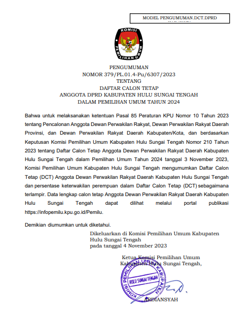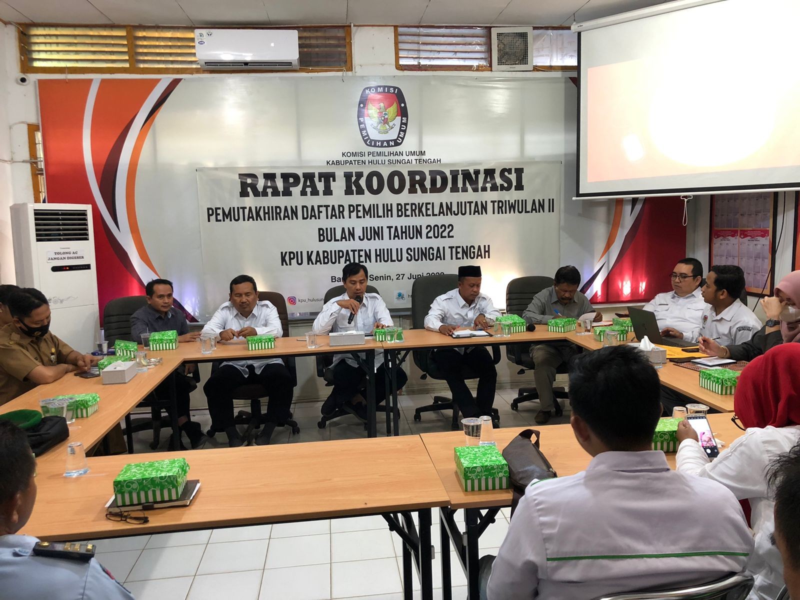 Menyongsong Pemilihan Umum Tahun 2024 yang akan dilaksanakan pada tanggal 14 Februari 2024, KPU Kabupaten Hulu Sungai Tengah mengadakan Rapat Koordinasi Mekanisme / Tata Cara Pindah Memilih pada Pemilihan Umum Tahun 2024 yang merupakan bentuk tanggung jawab untuk bisa menyukseskan Pemilu 2024. Acara yang dilaksanakan pada tanggal 26 Oktober 2023 bertempat di Aula KPU Kab. Hulu Sungai Tengah jalan Antasari No 13 Kelurahan Barabai Timur ini turut mengundang stakeholder terkait seperti Dinas Kependudukan dan Pencatatan Sipil Kab. HST, Badan Kesbangpol Kab. HST serta kantong - kantong potensial Daftar Pemilih Tambahan (DPTb) sepeti Pondok Pesantren Ibnul Amin Pemangkih, Pondok Pesantren Raudatul Ulum Hantakan, Pondok Pesantren Al - Muhajirin Pemangkih Seberang, Pondok Pesantren Nurul Muhibbin Barabai serta Pondok Pesantren Putri Rahmatul Ummah Pantai Hambawang Barat. Turut pula terundang sektor pemerintahan yang memiliki potensial DPTb seperti Kantor Pelayanan Pajak (KPP) Pratama Barabai, RSHD, Pengadilan Negri dan Kejaksaan Negeri Barabai serta perwakilan Partai Politik Peserta Pemilu Tahun 2024. Dalam Rapat Tersebut ada 9 Poin Alasan yang bisa diterima untuk pindah memilih yaitu : 1. Bertugas di tempat lain; 2. Menjalani Rawat Inap/Mendampingi Pasien Rawat Inap; 3. Tertimpa Bencana Alam/Sosial 4. Menjadi Tahanan Rutan / Lapas / Menjadi Narapidan; 5. Penyandang Disabilitas yang dirawat di Panti Sosial atau Panti Rehabilitasi; 6. Menjalani Rehabilitasi Narkoba; 7. Bekerja di Luar Domisili; 8. Menjalankan Tugas Belajar/Menempuh Pendidikan Menengah/Tinggi; 9. Pindah Domisili. Semua alasan pindah memilih tersebut harus memiliki bukti dukung yang akan diserahkan ketika mengurus pindah memilih. Pengurusan Pindah Memlih dapat dilakukan di tempat asal atau ditempat tujuan di KPU Kab/kota atau pada tingkat Kecamatan atau pada Tingkat Kelurahan/Desa. Dalam Sambutannya sebelum membuka Rakor tersebut, Bapak Siswandi menyampaikan syarat utama dalam pindah memilih ada 2 hal. yaitu terdaftar sebagai pemilih dan mengurus pindah memilih. hal ini ditekankan kepada peserta rakor supaya bisa membawa informasi tentang tata cara pindah memilih dalam Pemilihan Umum Tahun 2024 di Lingkungannya masing - masing. Diharapkan dengan adanya rakor ini dapat menyatukan perpsepsi tentang alasan pindah memilih serta pemilih di kantong - kantong potensial DPTb dapat menggunakan hak pilihnya pada saat 14 Februari 2024 mendatang.