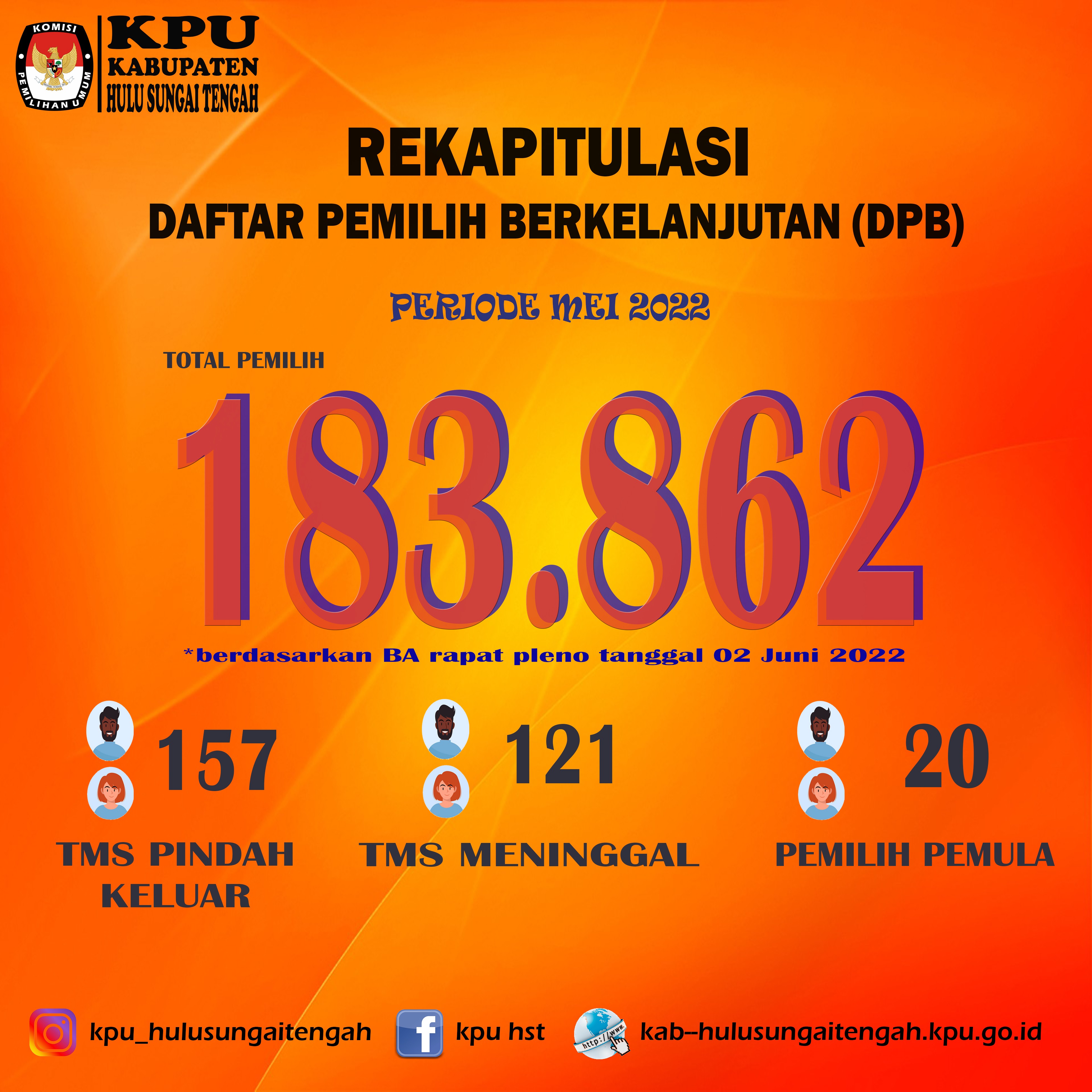 Untuk menyongsong Pemilihan Serentak 2024, KPU Kabupaten Hulu Sungai Tengah melaksanakan Pemutakhiran Daftar Pemilih Berkelanjutan (PDPB) Periode Mei 2022 yang dilaksanakan di Aula Kantor KPU Hulu Sungai Tengah Pada Hari Kamis, 2 Juni 2022. Rapat ini Dihadiri oleh Jajaran Komisioner KPU Kabupaten Hulu Sungai Tengah, Bawaslu Kabupaten Hulu Sungai Tengah serta Perwakilan dari Dinas Kependudukan dan Pencatatan Sipil Kabupaten Hulu Sungai Tengah. Daftar Pemilih Berkelanjutan yang ditetapkan sebanyak 183.862 pemilih yang terdiri dari 91.252 pemilih laki - laki dan 92.610 pemilih perempuan. Total sebanyak 298 orang pemilih yang telah dimutakhirkan, Berbeda dengan periode bulan sebelumnya. Ada penurunan jumlah pemilih yang dimutakhirkan yaitu sebanyak 125 orang pemilih, hal ini bergantung pada ketersediaan sumber data yang kita dapatkan di lapangan. Adapun rincian data yang dimutakhirkan periode ini yaitu sebanyak 157 orang pemilih keluar dan 121 orang pemilih yang telah meninggal dunia, data ini sudah kami lakukan verifikasi dengan pihak Disdukcapil Kab. HST begitu pula dengan 20 orang data pemilih pemula yang kami tambahkan ke DPB. Setelah ditetapkan Hasil Rekapitulasi ini kami sampaikan juga kepada Bawaslu Kabupaten Hulu Sungai Tengah. Berikut ini kami sampaikan lampiran kegiatan Rekapitulasi DPB Periode Mei 2022 1. Berita Acara 2. Pengumuman A-DPB