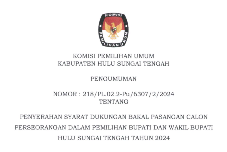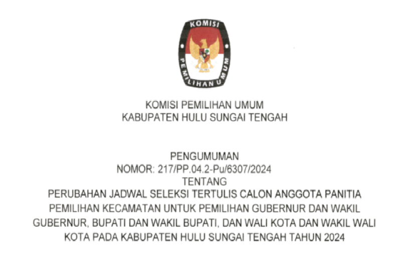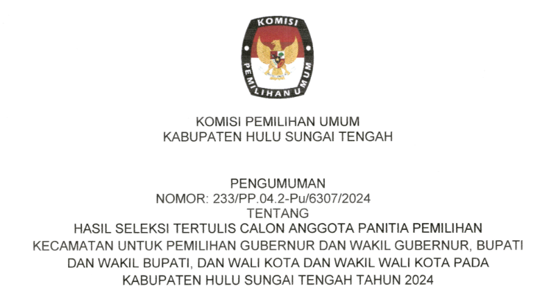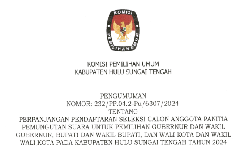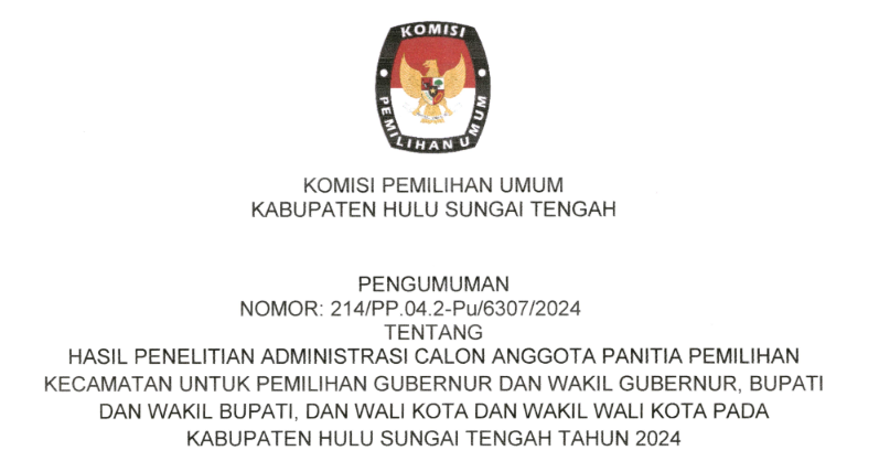 Sehubungan dengan Komisi Pemilihan Umum Kabupaten Hulu Sungai Tengah telah melaksanakan tahapan Penelitian Administrasi Calon Anggota Panitia Pemungutan Suara pada untuk Pemilihan Gubernur dan Wakil Gubernur, Bupati dan Wakil Bupati, dan Wali Kota dan Wakil Wali Kota Tahun 2024, disampaikan beberapa hal sebagai berikut: