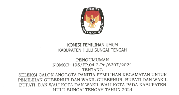 Dalam rangka pembentukan Calon Anggota Panitia Pemungutan Suara untuk Pemilihan Gubernur dan Wakil Gubernur, Bupati dan Wakil Bupati, dan Wali Kota dan Wakil Wali Kota Tahun 2024, Komisi Pemilihan Umum Kabupaten Hulu Sungai Tengah mengundang Warga Negara Indonesia yang memenuhi kualifikasi untuk mendaftarkan diri menjadi Panitia Pemungutan Suara untuk Pemilihan Gubernur dan Wakil Gubernur, Bupati dan Wakil Bupati, dan Wali Kota dan Wakil Wali Kota