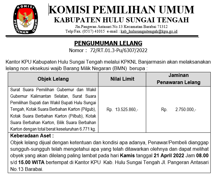 Kantor KPU Kabupaten Hulu Sungai Tengah melalui KPKNL Banjarmasin akan melaksanakan lelang non eksekusi wajib Barang Milik Negaran (BMN) berupa Surat Suara Pemilihan Gubernur dan Wakil Gubernur Kalimantan Selatan, Surat Suara Pemilihan Bupati dan Wakil Bupati Hulu Sungai Tengah, Kotak Suara Berbahan Karton (Pilgub), Kotak Suara Berbahan Karton (Pilbub), Kotak Suara Berbahan Karton, Bilik Suara Berbahan Karton dengan total berat keseluruhan 6.771 kg.